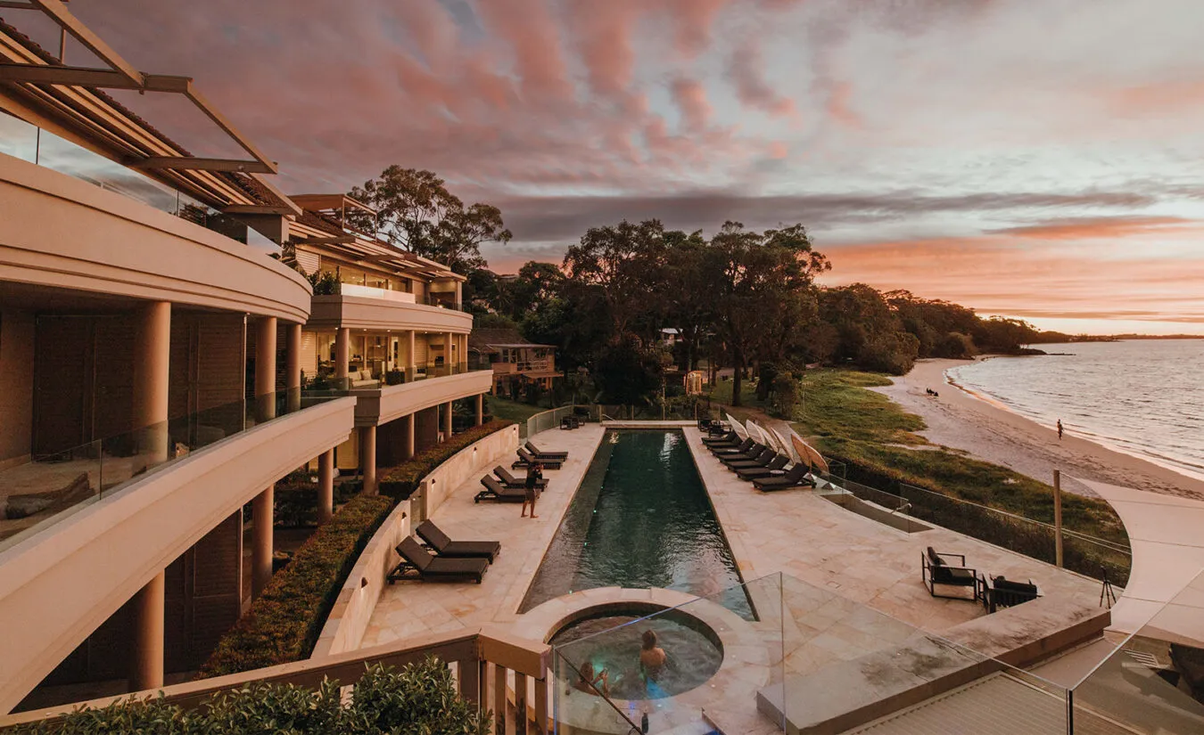 Positioned meters from the waters edge, via the white sands of Dutchman’s Beach in Nelson Bay all apartments have floor to ceiling windows which allow guests to gaze out over the pristine waters of the bay towards the shores of the Myall Lakes National Park .