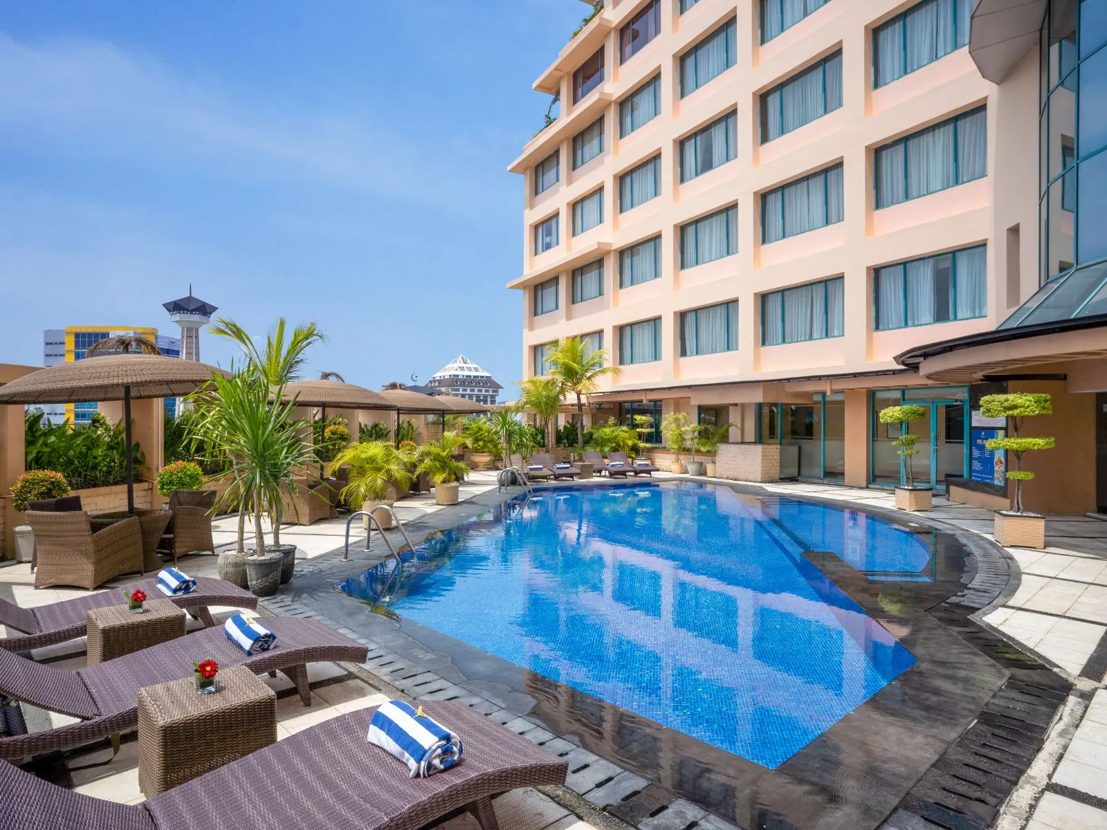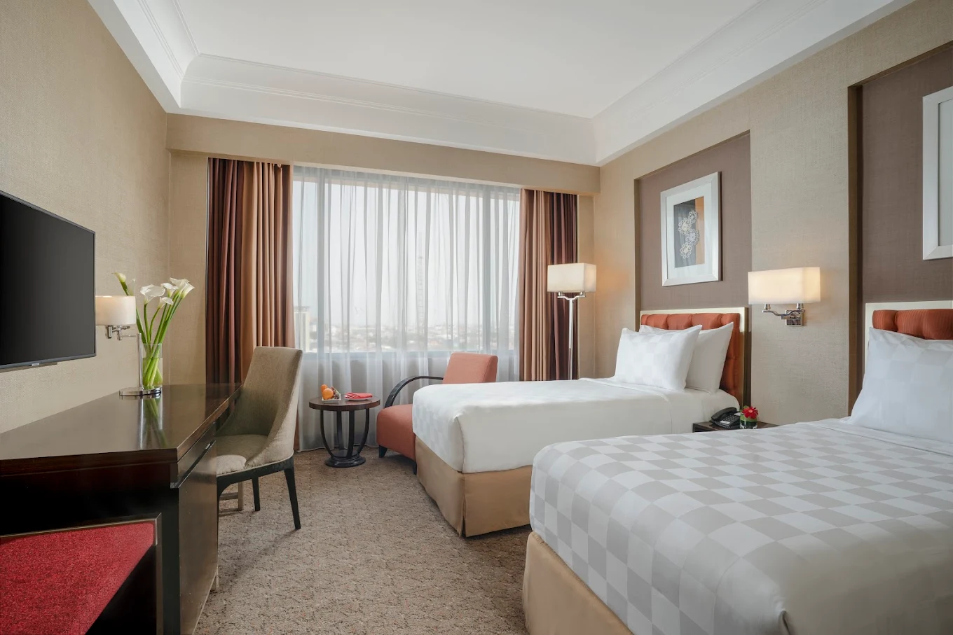 Our 200 elegantly appointed guestrooms and suites provide the ultimate in comfort, complete with smart TVs, high-speed Wi-Fi, in-room safes, and generous workspaces. Guests can savor a delightful culinary journey at our Gallery Restaurant, enjoy light refreshments at the Lobby Lounge, or unwind with curated wines from our Wine Cellar. For sweet indulgences, our Hotel Ciputra Bakery offers fresh pastries and breads daily. Relax and rejuvenate at our Lotus Spa, featuring a sauna, outdoor pool, and fully equipped fitness center. For events, our meeting rooms accommodate up to 100 guests—ideal for business functions and social gatherings. At Hotel Ciputra Semarang, our personalized service ensures your stay is as memorable as it is comfortable.